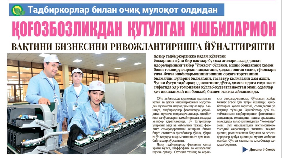 Буларни билмагани, тасаввур қилмагани ҳам яхши. Чунки бугун тадбиркор давлатнинг дўсти, ҳимоясидаги соҳа эгаси сифатида ҳар томонлама қўллаб-қувватланаётган экан, одамлар ҳеч иккиланмай иш бошлаб, бизнес эгасига айланмоқда.