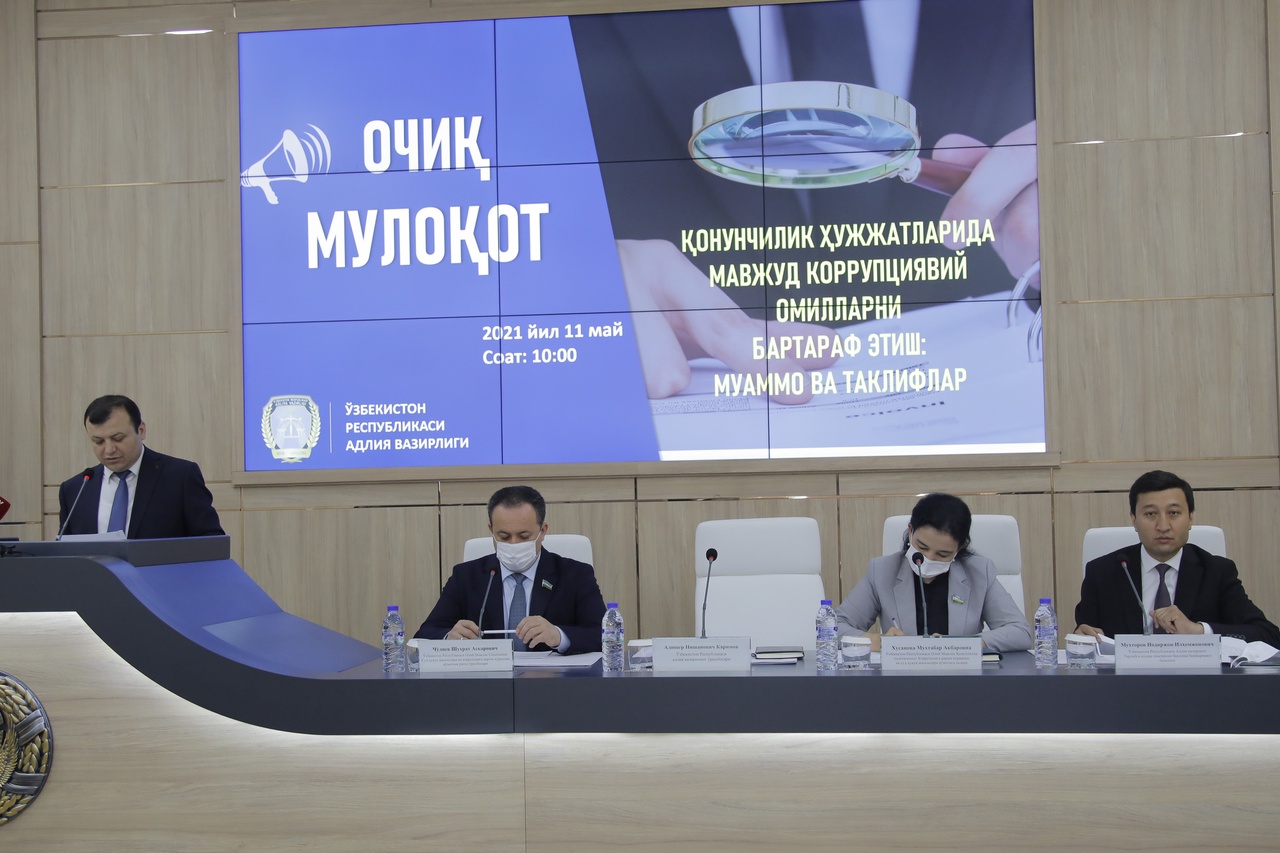 Адлия вазирлигида қонунчилик ҳужжатлари ва улар лойиҳаларини коррупцияга қарши экспертизадан ўтказиш, аниқланган коррупциявий омилларни бартараф этиш бўйича амалга оширилаётган ишлар натижаларини жамоатчиликка етказиш ҳамда экспертиза жараёнларини янада такомиллаштиришга оид таклифларни муҳокама қилиш мақсадида очиқ мулоқот ўтказилди.
