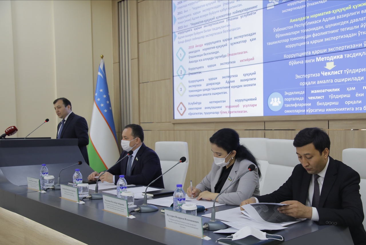 Тадбирда Адлия вазирлиги томонидан 2021 йилнинг биринчи чорагида ўтказилган қурилиш, соғлиқни сақлаш, олий таълим ва давлат харидлари соҳаларига оид амалдаги норматив-ҳуқуқий ҳужжатларнинг коррупцияга қарши экспертизаси натижалари таҳлил қилинди ва кенг муҳокама қилинди.