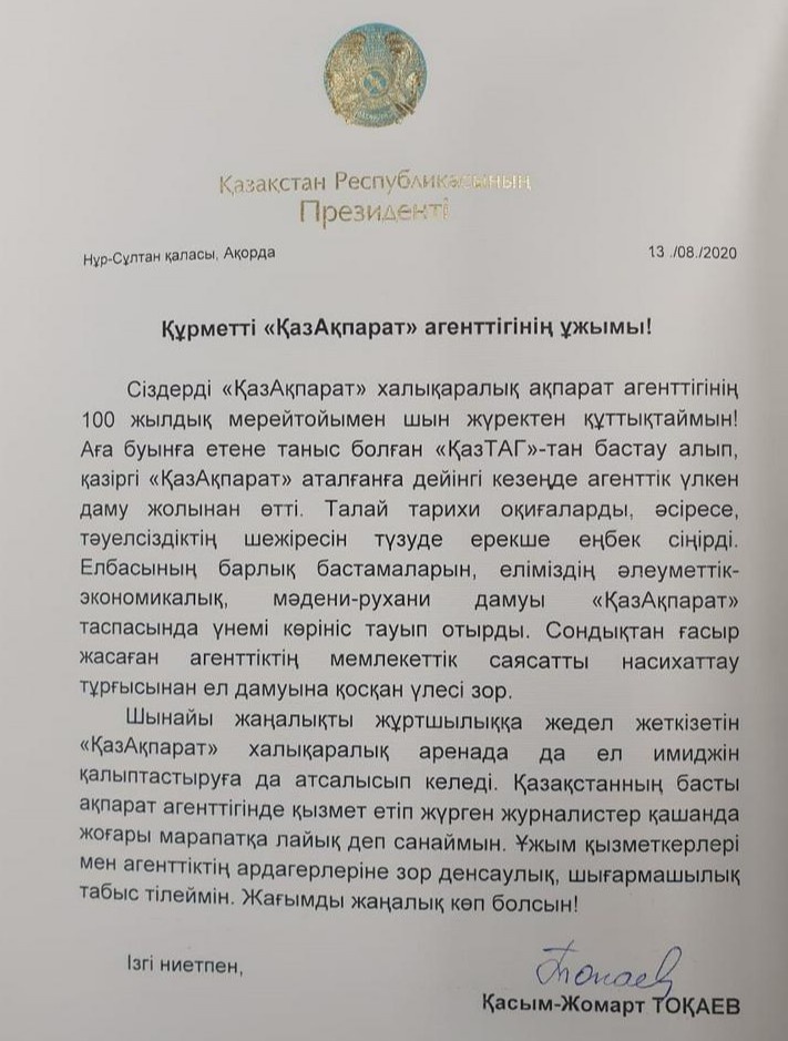 “Мен ишонаманки, Қозоғистоннинг етакчи ахборот агентлигида фаолият юритаётган журналистлар ўзларининг меҳнати учун ҳар доим юқори мукофотларга лойиқдир. Агентлик ходимлари ва фахрийларига мустаҳкам соғлиқ ва ижодий муваффақият тилайман. Яхши хабарлар бардавом бўлсин!” дейилади табрик матнида.