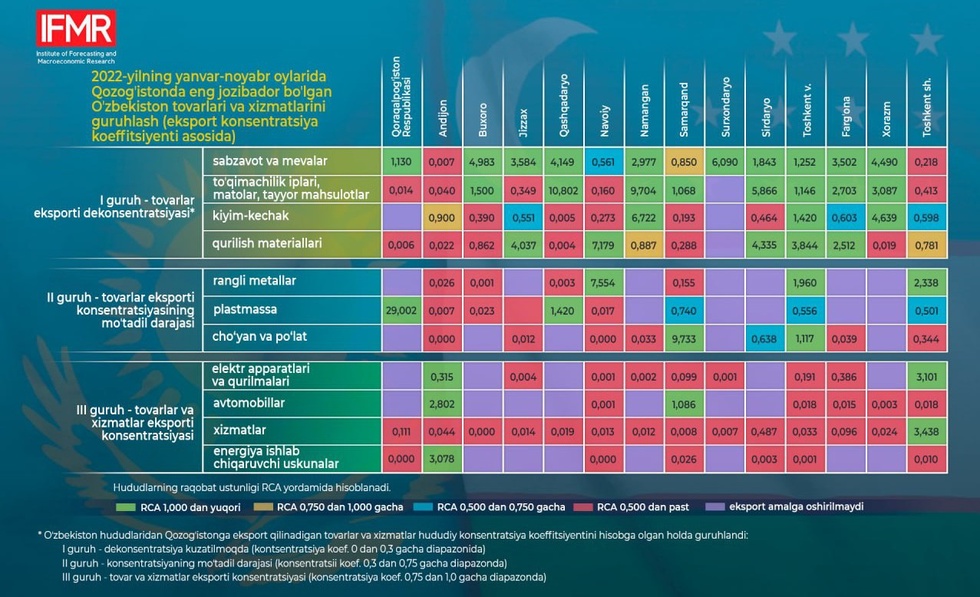 Умуман, Қозоғистон бозорида Ўзбекистон ҳудудлари мавқеининг мустаҳкамланиши учун қўшимча имкониятларни излаб топиш товарлар ва хизматлар бўйича экспортни қуйидагилар ҳисобига диверсификация қилишга боғлиқ:
