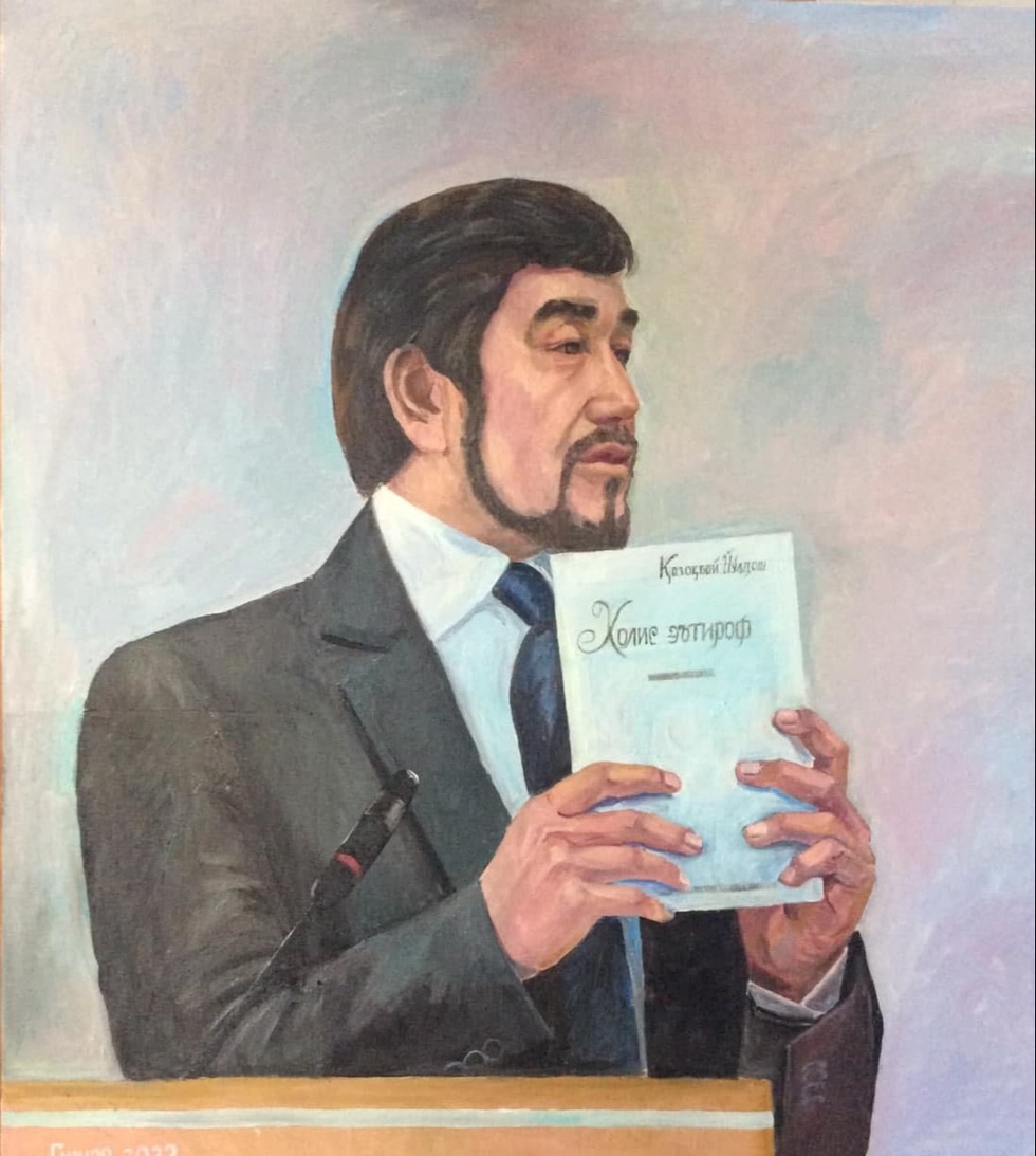Куни кеча Ўзбекистон Ёзувчилар уюшмаси аъзоси, таниқли рассом Гулнора Раҳмон ана шундай асарлардан бирини якунлади. У Ўзбекистон Ёзувчилар уюшмаси аъзоси, педагогика фанлари доктори, адабиётшунос олим Қозоқбоӣ Ӣӯлдош портретини чизди. Суратда адабиётшунос ўзининг “Холис эътироф” китобини минбардан туриб кўрсатаётгани тасвирланган. “Гулнор-2022”, дея имзо қўйилган, матога мойбўёқда ишланган суратнинг ҳажми 80х70 экан.