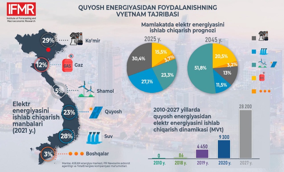 Прогнозлаштириш ва макроиқтисодий тадқиқотлар институти мутахассисларининг ўрганишларига кўра, 2017 йилда Вьетнам энергетика секторида электр энергиясини ишлаб чиқаришда қуёш энергиясидан деярли фойдаланилмаган. Вьетнам ҳукумати ислоҳотлар жараёнида ушбу секторни йирик қуёш фермалари томонидан ишлаб чиқарилган энергияни юқори нархда (1 киловатт соати учун 9 цент) сотиб олиш орқали қўллаб-қувватлади. Натижада 2019 йилга келиб, қуёш энергиясидан режада кутилган 850 МВт қувват ўрнига 5 ГВт га тенг электр энергияси ишлаб чиқарилди.