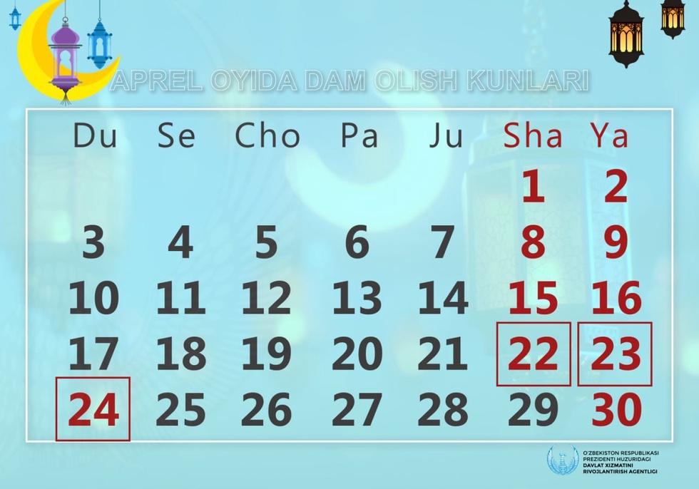 - 24 апрель — душанба (кўчирилган дам олиш).