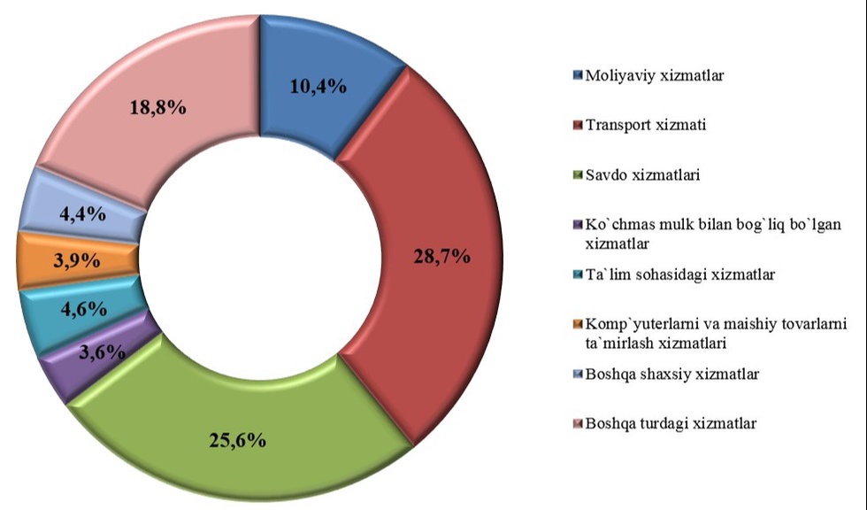 Бозор хизматларининг номинал ҳажми 25 155,7 млрд. сўмга ошган. Ўтган йилнинг шу даврига нисбатан ўсиш суръати 102,3 % ни ташкил этган.