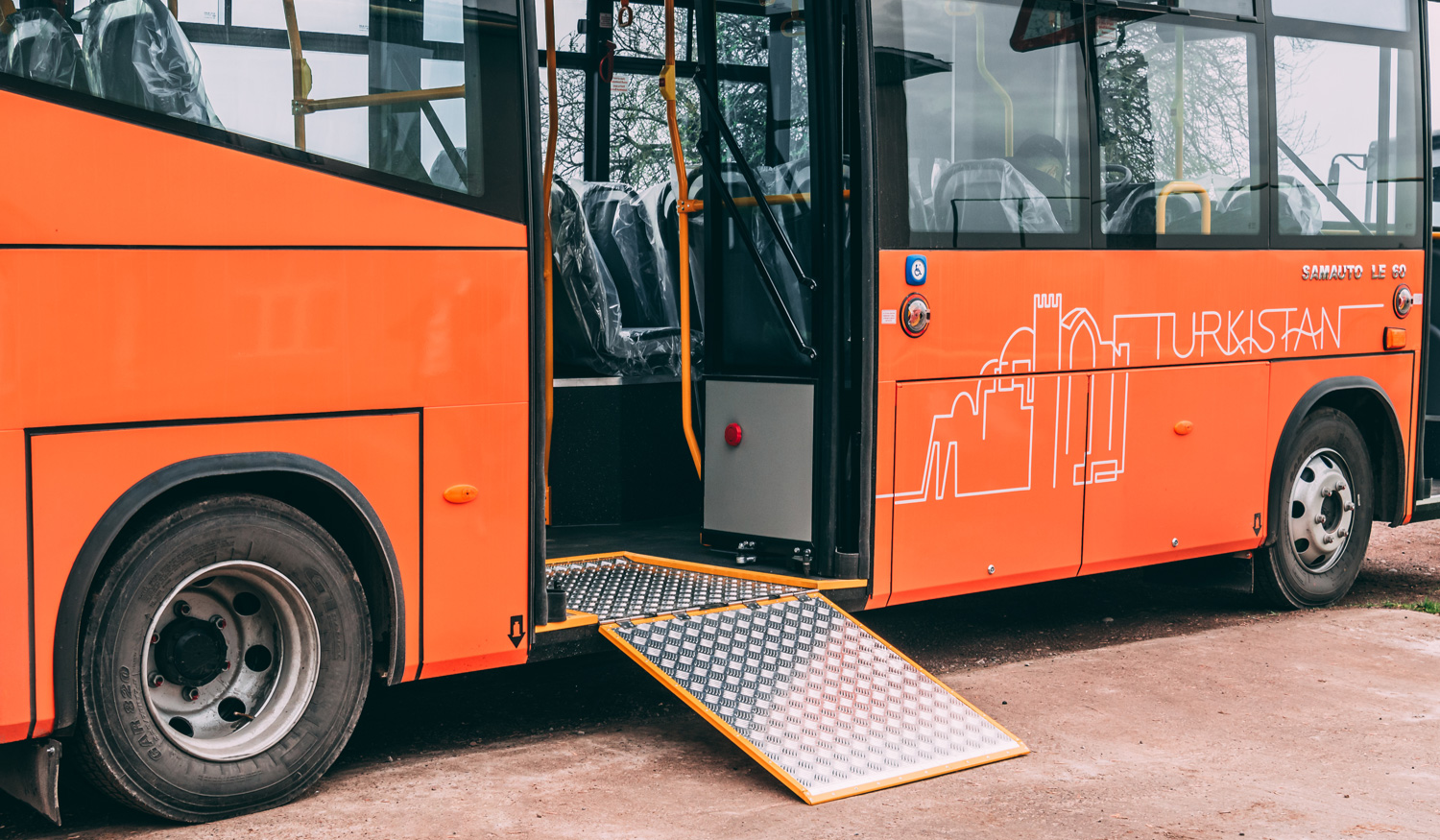 SAZ LE60 автобуси 56 йўловчи (25 та ўриндиқ) га мўлжалланган. Туркистонда линияга чиққан автобуслар пандуслар, йўл ҳақи тўлашнинг электрон тизимлари, кондиционерлар, видеокузатув камералари ва йўловчиларга аудиоахборот етказиш тизимлари билан жиҳозланган.