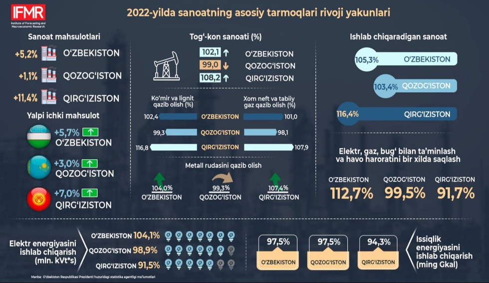 Прогнозлаштириш ва макроиқтисодий тадқиқотлар институти мутахассислари 2022 йилда саноатнинг асосий тармоқлари фаолиятида қайд этилган натижаларни Марказий Осиё минтақасининг айрим мамлакатларида қайд этилган натижалар билан таққослаган ҳолда таҳлил қилди.