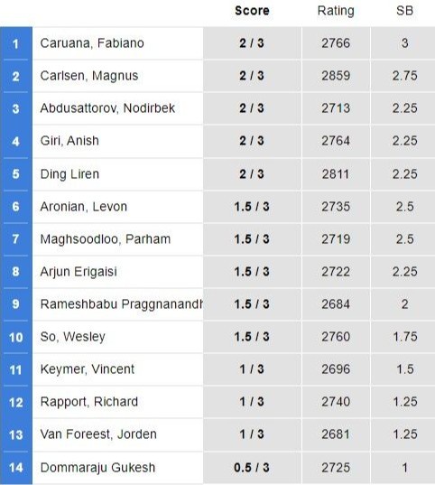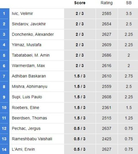 Эслатиб ўтамиз, ҳозирча мусобақада 3 та тур ўйинлари ортда қолди ва эътиборли жиҳати, шахматчиларимиз баҳсларда мағлубиятсиз одимлаяпти. Шу тариқа "Мастерс" гуруҳида Нодирбек Абдусатторов 2 очко билан 3-ўринни эгаллаб турибди. "Челленжер" гуруҳидаги Жавоҳир Синдаров ҳам 2 очко тўплаган ва ўз гуруҳида 2-поғонага жойлашган.