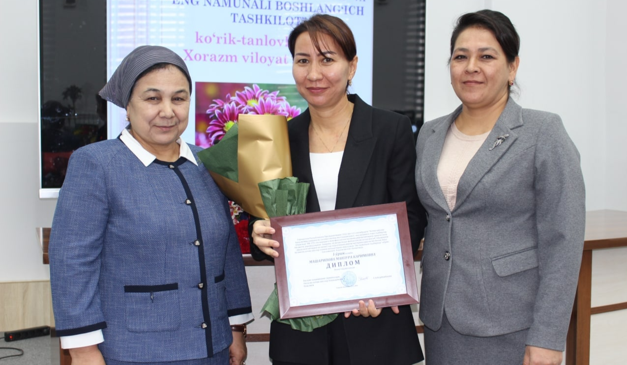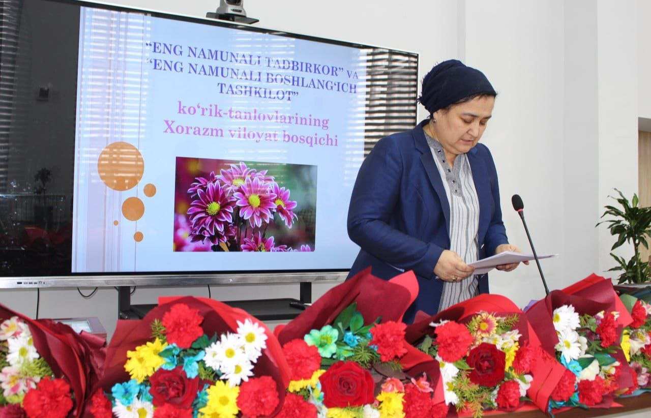 «Энг намунали бошланғич ташкилот» танловининг вилоят босқичида вилоят Соғлиқни сақлаш бошқармаси бош акушер гинекологи Севара Жуманиёзова биринчиликка, вилоят прокуратураси бўлими бошлиғи Садоқат Рўметова иккинчи ўрин, Урганч давлат педогогика иниститути хотин-қизлар маслаҳат кенгаши раиси, филология фанлари номзоди доцент Аноргул Атажонова учинчи ўринга лойиқ кўрилди.