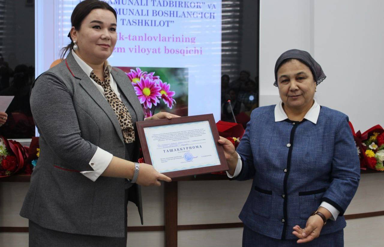 «Энг намунали мактабгача таьлим хотин-қизлар бошланғич ташкилот», «Энг намунали банк хотин-қизлар бошланғич ташкилоти», «Энг намунали Олий ўқув юрти хотин-қизлар бошланғич ташкилоти», «Энг намунали корхона хотин-қизлар бошланғич ташкилоти», «Ҳарбий қисм юрти хотин-қизлар бошланғич ташкилоти» номинатсияларида идора-ташкилотлар, корхоналарда фаолият юритаётган хотин-қизлар бошланғич ташкилотлари раислари тақдирланди.