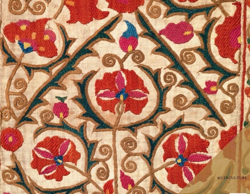 Бу ажойиб кашталар Бухоро амирлиги давридаги санъатнинг олтин асрига тааллуқли, улар матоларни машинада тўқиш ва бўялган иплар оммалашишидан олдин тайёрланган.