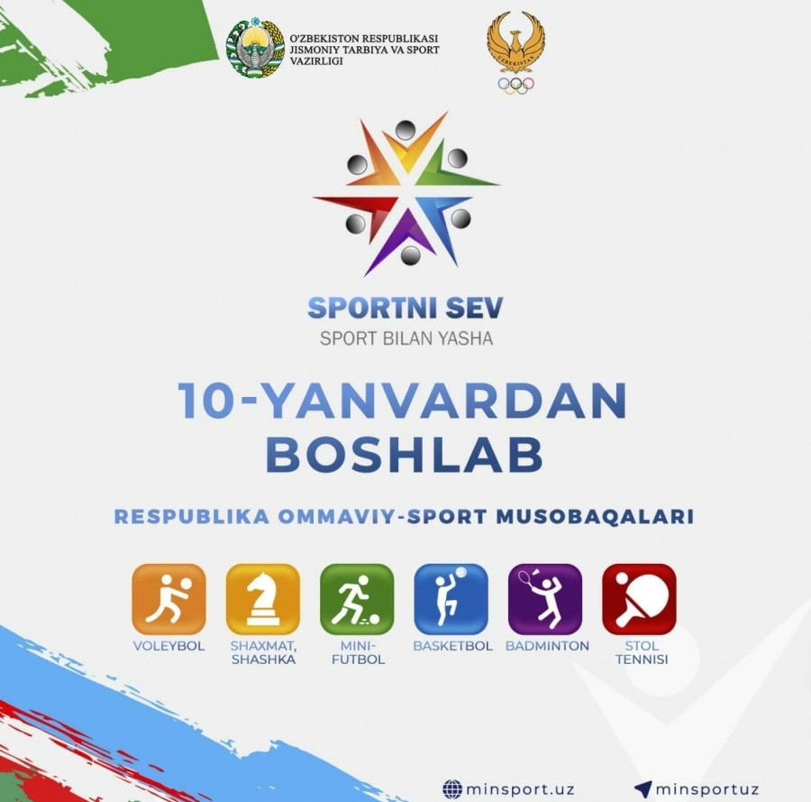 10 январдан бошлаб республикамизнинг барча ҳудудларида «Спортни сев, спорт билан яша!” шиори остида катта спорт фестивали ўтказилади.