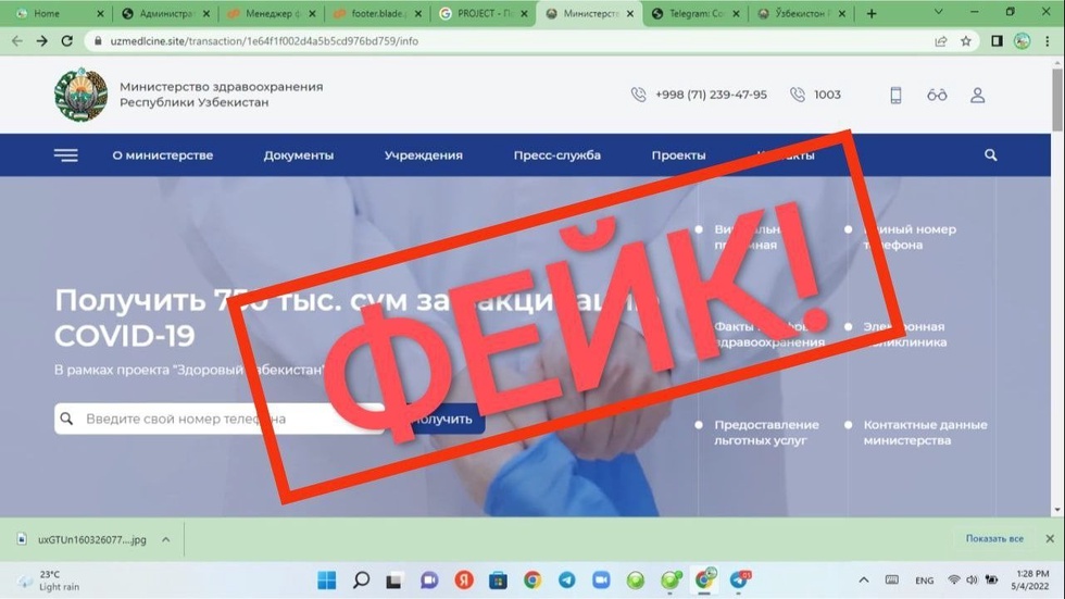 Хусусан, вазирликнинг расмий веб-сайти билан бир хил дизайнда тайёрланиб, унинг асосий фонида вакцина олганларга 750 минг сўм миқдорида пул маблағи берилиши айтилган. Бунинг учун шахсий маълумотларни киритиш сўралган.