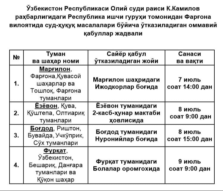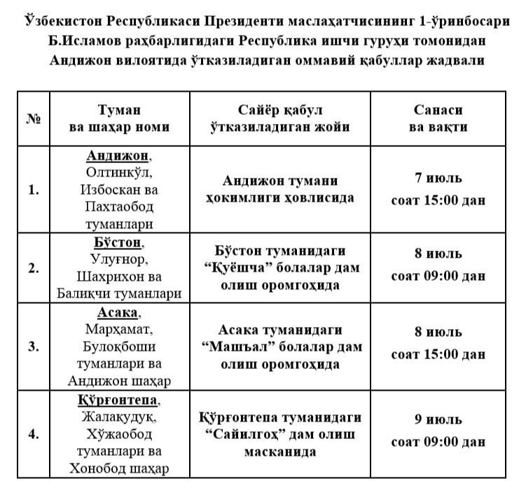 Ўзбекистон Республикаси Президенти маслаҳатчисининг биринчи ўринбосари Бахтиёр Исламов раҳбарлигидаги ишчи гуруҳи Андижон вилоятида, Олий суд раиси Козимжон Камилов раҳбарлигидаги ишчи гуруҳи эса Фарғона вилоятида жорий йилнинг 7-9 июль кунлари иш олиб боради.
