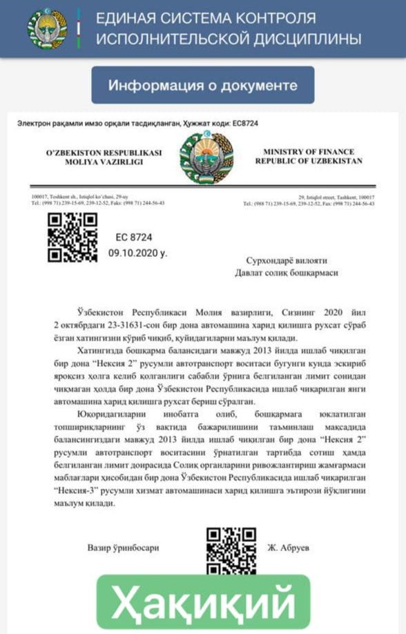 Ушбу мурожаатга Молия вазирлиги 2020 йил 9 октябрда ЕС 8724-сонли жавоб хати йўлланган. Унга кўра, Бошқарма балансидаги “Нексия-2” русумли автомашинасини ўрнатилган тартибда сотиб, ўрнига белгиланган лимит доирасида Солиқ органларини ривожлантириш жамғармаси маблағлари ҳисобидан бир дона “Нексия-3” автомашинаси харид қилишга розилик билдирган.