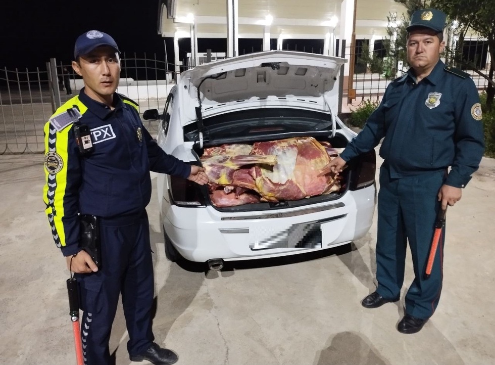 Шунингдек, 7 май кунидан 8 май кунига ўтар кечаси соат 02:30 ларда шу йўналиш бўйлаб ҳаракатланиб келаётган Денов туманида яшовчи 2000 йилда туғилган фуқаро А.А. бошқарувидаги Кобальт русумли автомашина тўхтатилиб юкхонаси текширилганда ҳеч қандай ветеринария ҳужжатларисиз 475 (тўрт юз етмиш беш) кг йирик шохли мол гўшти олиб кетаётганлиги аниқланган.