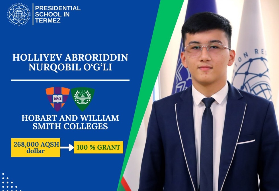 Қайд этилишича, Термиз шаҳридаги Президент мактабининг 11-синф ўқувчиси Аброриддин Ҳоллиев АҚШнинг Nyu York шаҳрида жойлашган “Hobart and William Smith Colleges” олийгоҳига 268 000 доллар миқдоридаги 100 фоизлик грант асосида ўқишга қабул қилинди.
