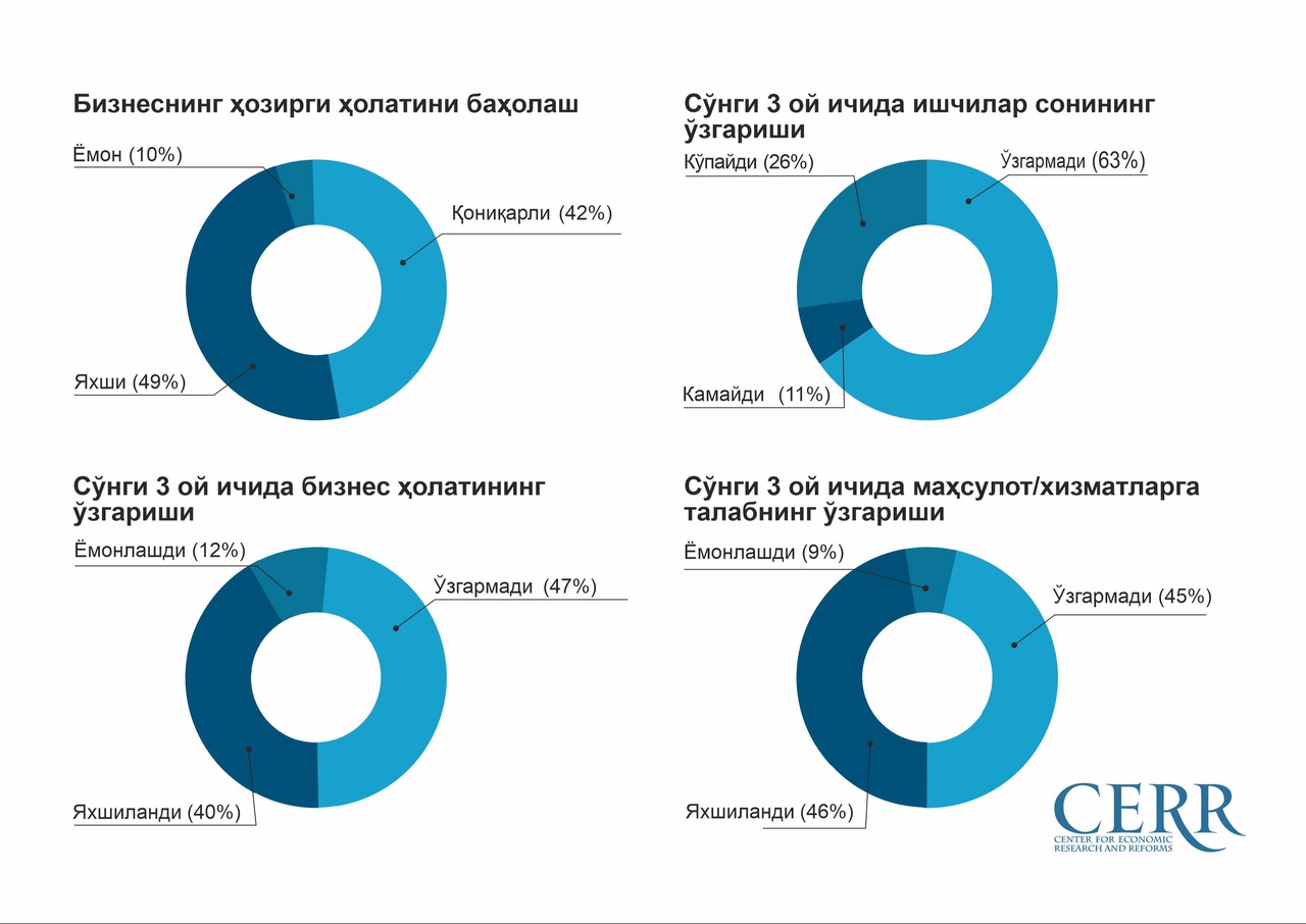 Ўз бизнесининг ҳозирги ҳолатини яхши, деб қайд этган респондентларнинг улуши 43 фоиздан 49 фоизгача ошди ва аксинча, ёмонлашганини қайд этган респондентлар сони 17 фоиздан 12 фоизгача камайди.