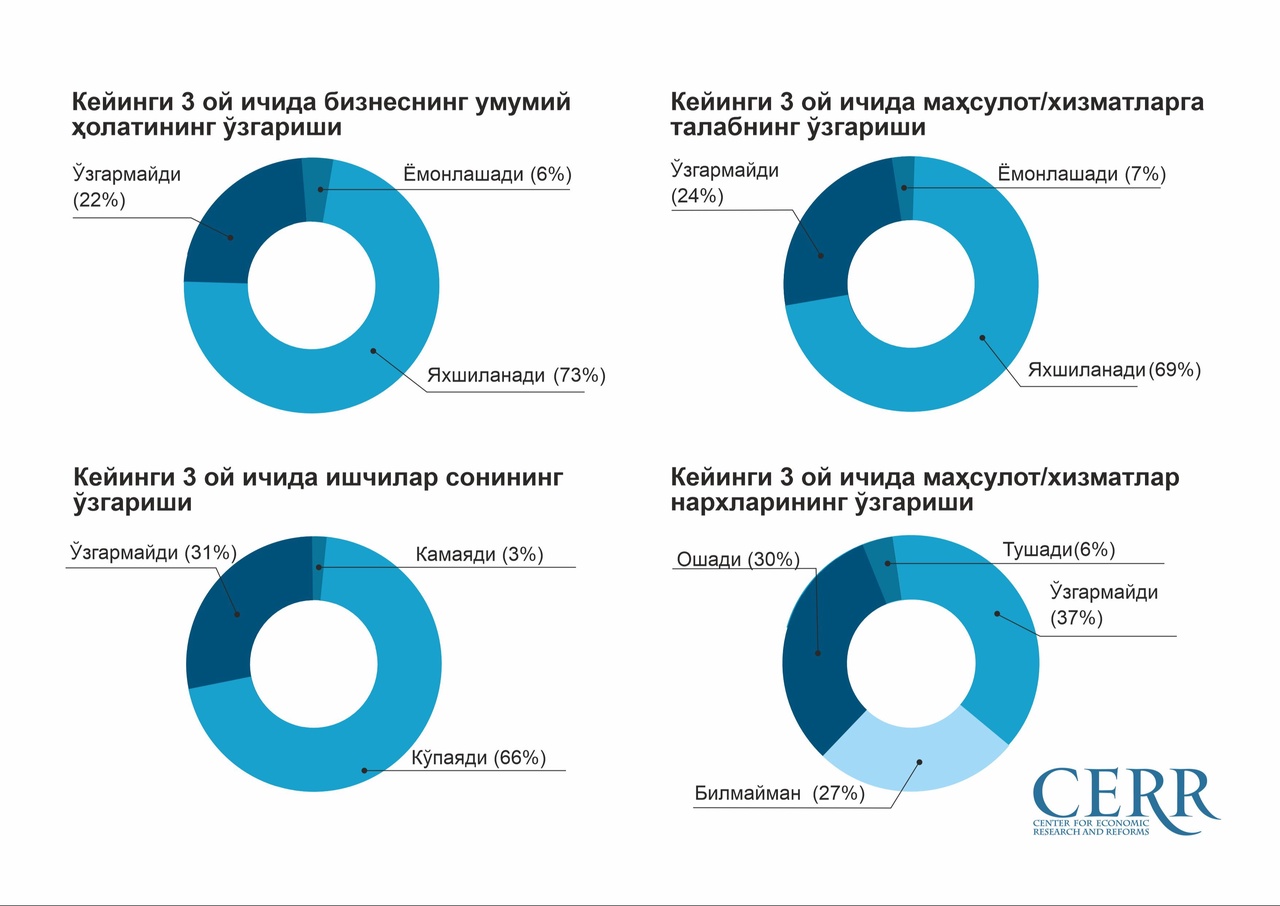 Кейинги 3 ой ичида бизнесни ривожлантириш истиқболларининг оптимистик тахминлари корхоналарнинг 73 фоизи ўз бизнес истиқболлари яхшиланганини, 69 фоизи товар ва хизматларга талабнинг янада ўсишини кутиши ва 66 фоизи ишчилар сонини кўпайтиришни режалаштириши билан тавсифланади.