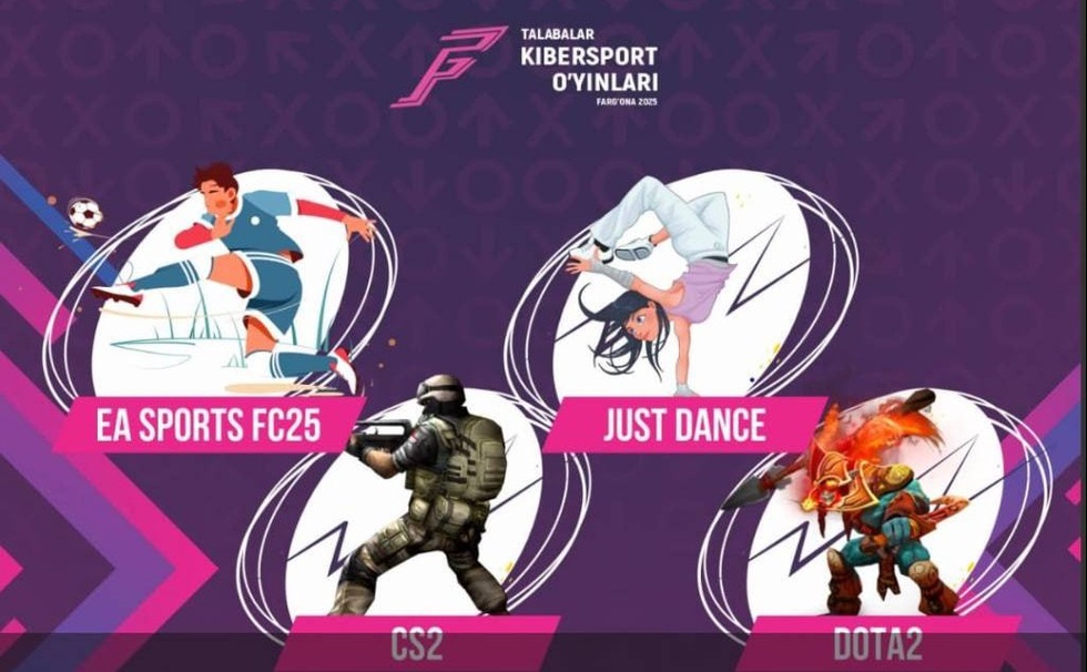 “Талабалар киберспорт ўйинлари – 2025” мусобақалари “Dota2”, “CS2”, “FC25” ўйинлари ҳамда “Just Dance” фижитал рақс бўйича 3 босқичда ташкил этилиши назарда тутилган.