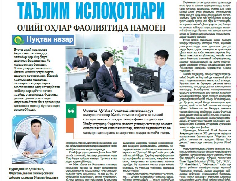 Олийгоҳ “QS Stars” баҳолаш тизимида тўрт юлдузга сазовор бўлиб, таълим сифати ва илмий салоҳиятининг халқаро эътирофини тасдиқлади. Ушбу ютуқлар Фарғона давлат университетида амалга оширилаётган янгиланишлар, илмий тадқиқотлар ва халқаро ҳамкорлик самарасини яққол намоён этади.