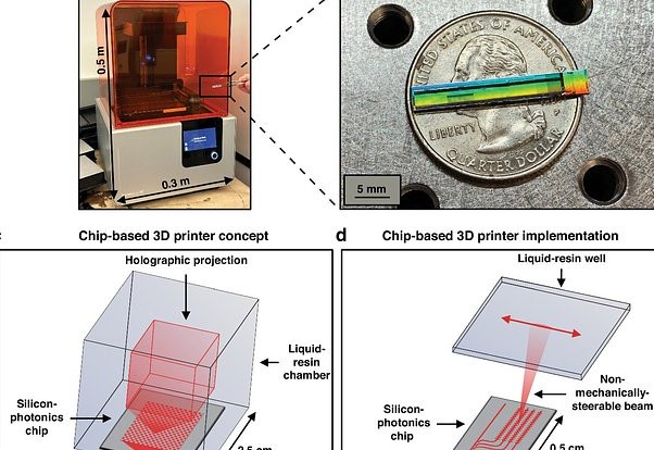 Мазкур принтер – кўринадиган ёруғлик таъсирида қотиб қоладиган суюқ қатронлар омборига қайта созланиши мумкин бўлган ёруғлик нурларини чиқарадиган миллиметрли фотоник чипдан иборат миниатюра қурилма.