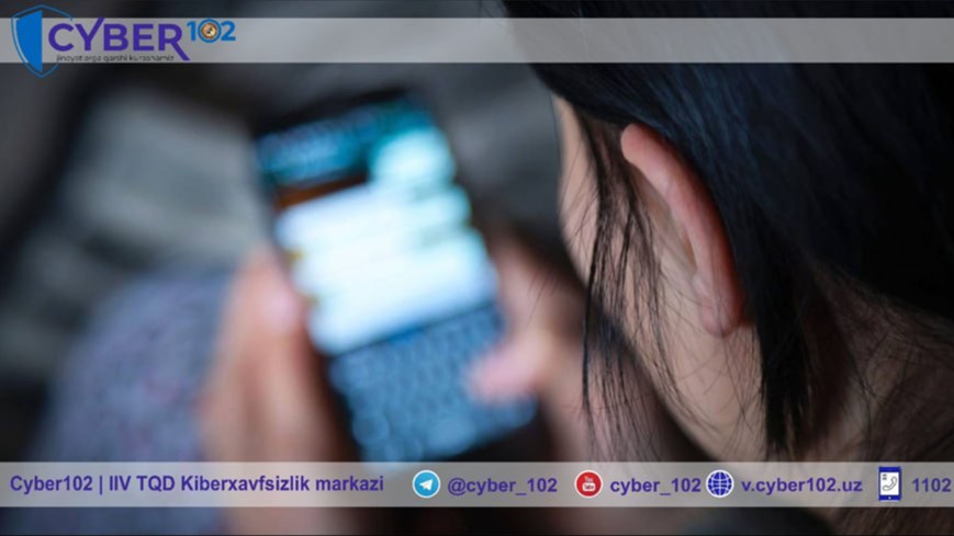 Хоразм вилояти Урганч шаҳрида яшовчи 32 ёшли (аёл) Ш.Н. ўзини “Тимур” деб таништирган Телеграм мессенжери фойдаланувчиси билан танишиб қолгани ва унга ўзининг беҳаё фотосуратларини юборганини, ушбу фотосуратларини тарқатиб юбориш билан қўрқитиб, “Тимур” ундан 1.300 АҚШ доллари пул талаб қилаётганини маълум қилган.