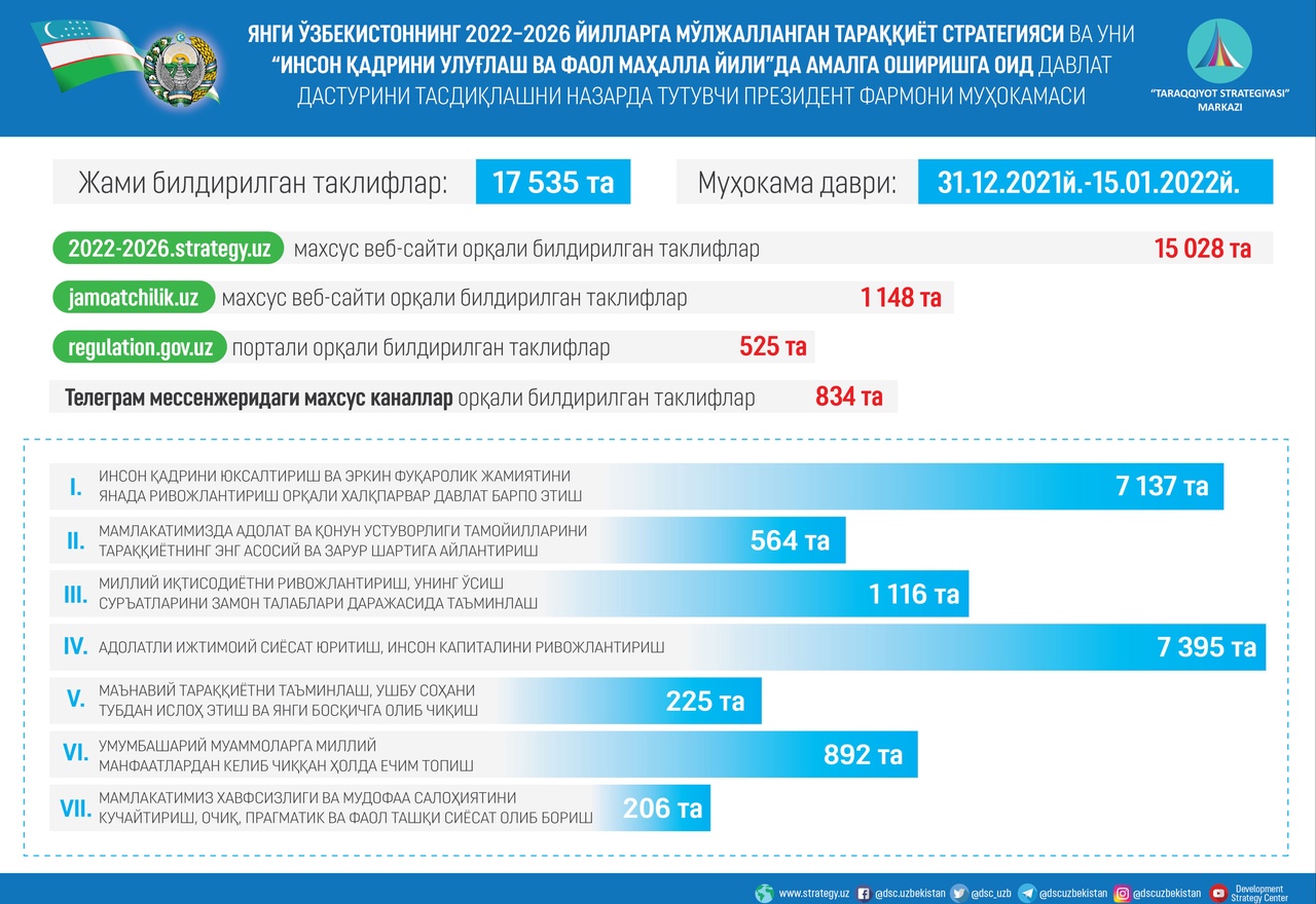 Олиб борилган қизғин ва жиддий муҳокамалар асносида, фақатгина электрон платформалар орқали жами 17 535 та таклиф, шу жумладан «Тараққиёт стратегияси» марказининг 2022-2026.strategy.uz махсус веб-сайтига жамоатчилик муҳокамасига қўйилган даврдан то 2022 йилнинг 15 январь кунига қадар жами 15 028 та, jamoatchilik.uz веб-сайтига жами 1 148 та, regulation.gov.uz веб-сайтига жами 525 та, @YangiTaraqqiyotStrategiyasi ва @dscuzbekistan телеграм каналлари орқали 834 та таклиф келиб тушди.