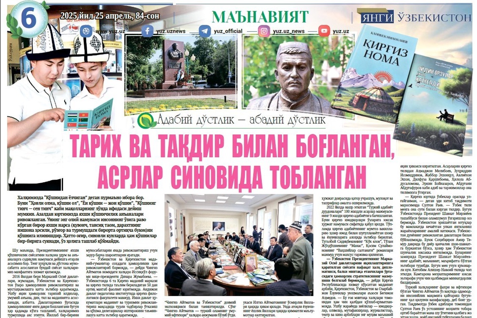 Шу кунларда юртимизда Қирғизистон Ёзувчилар уюшмаси делегацияси меҳмон бўлиб турибди. Давлатимиз раҳбарининг 2023 йил 26-27 январь кунлари ушбу мамлакатга давлат ташрифи чоғида кўплаб келишувларга эришилган эди. Улар орасида маданий алоқалар алоҳида ўрин тутади. Зеро, адабиёт ва санъат дилларни дилларга боғлайди. Шу боис, келишувлар ижросини таъминлаш учун “йўл харитаси” тасдиқланган. Қирғиз ижодкорларининг ташрифи ана шу вазифалар ижроси доирасида уюштирилди. Кун тартибидан ўрин олган адабий-маърифий тадбирлар халқларимизнинг мақсади, эзгу нияти, адабиёти ва тили муштарак эканини яна бир бор намойиш қилди.