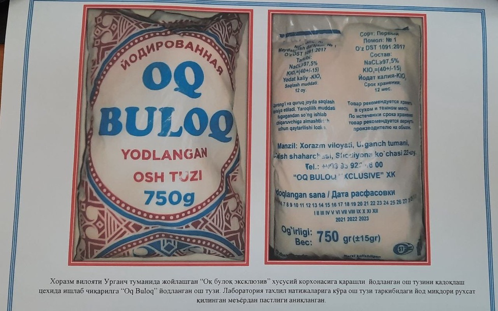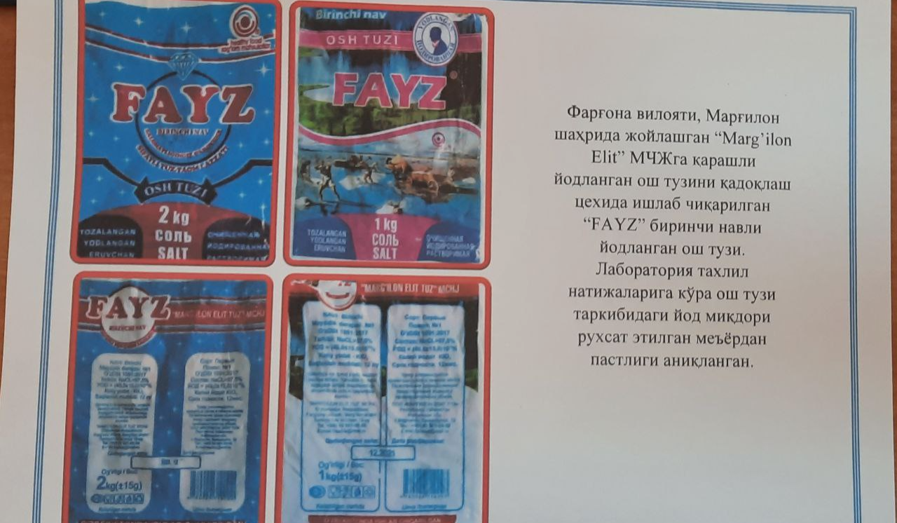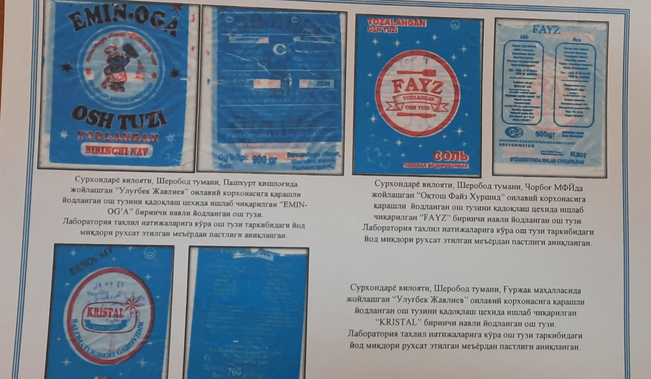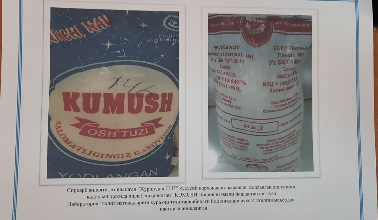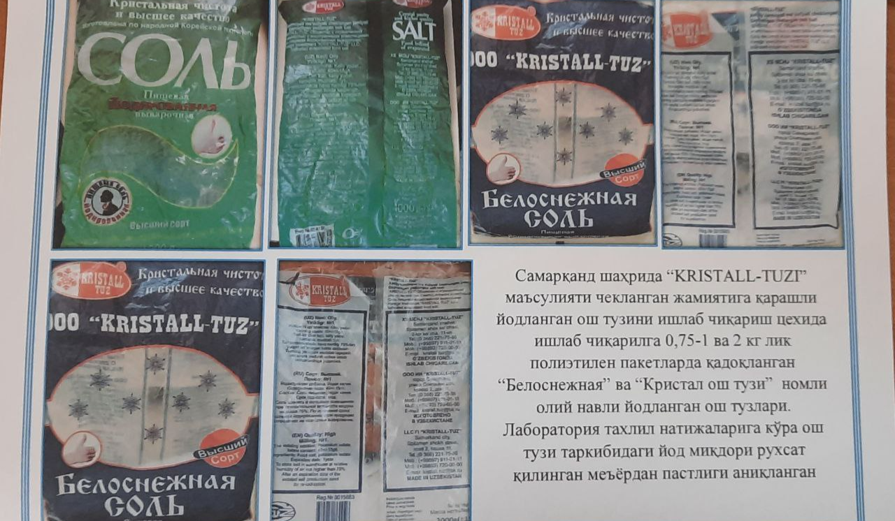 Мутахассислармиз томонидан юқорида суратлари келтирилган ош тузларида инсон саломатлиги учун муҳим бўлган йод миқдорининг етишмаслиги аниқланди.
