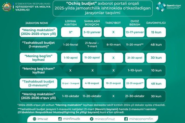 - "Ташаббусли бюджет"нинг 1-мавсуми февраль-март ойларига мўлжалланган. Лойиҳаларни киритиш 1-20 февралда, овоз бериш эса 11-20 март оралиғида бўлади.