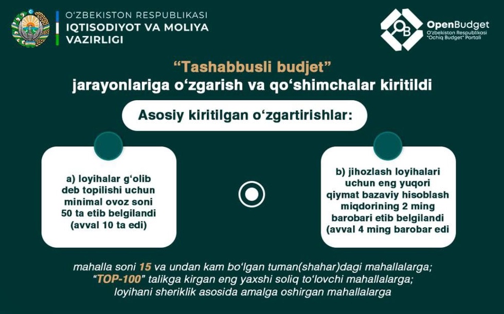 • Лойиҳалар ғолиб деб топилиши учун минимал овозлар сони 50 та этиб белгиланди (бунгача 10 та эди);
