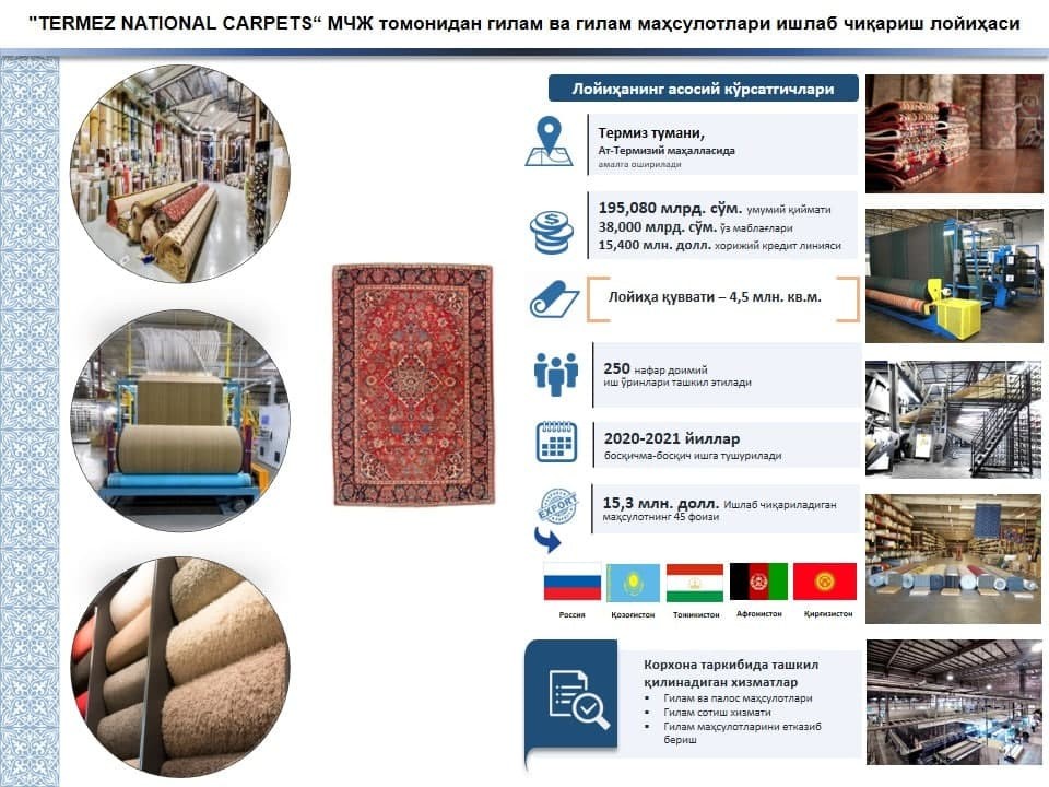 Қирғизистон каби давлатларга гилам ва гилам маҳсулотлари етказиб бериш режалаштирилган.