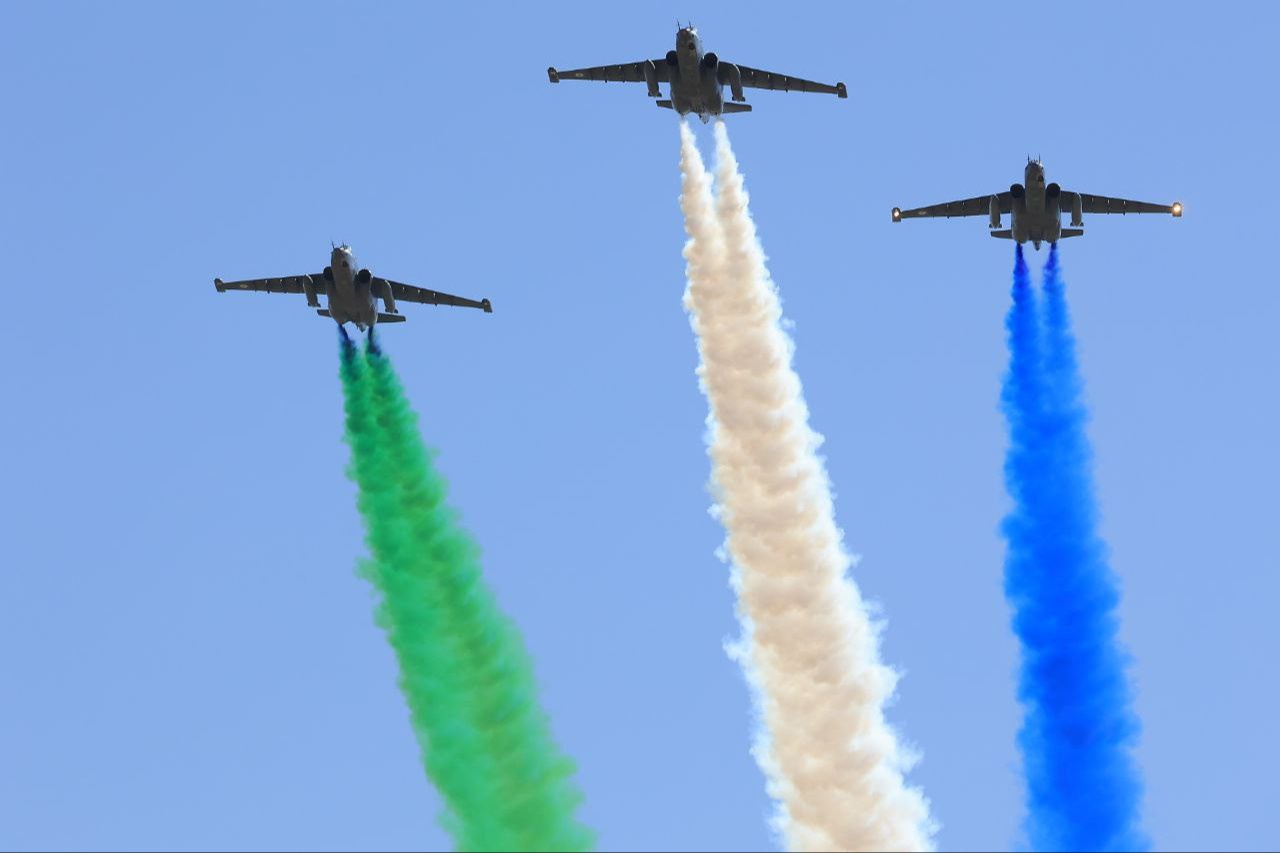 Авиапарвозларда жанговар ва ҳарбий-транспорт самолётлари ҳамда вертолётлар учувчилари ўз маҳоратини намойиш этди. Улар томонидан самода Ўзбекистон Республикаси Давлат байроғи тасвири ҳосил қилинди.