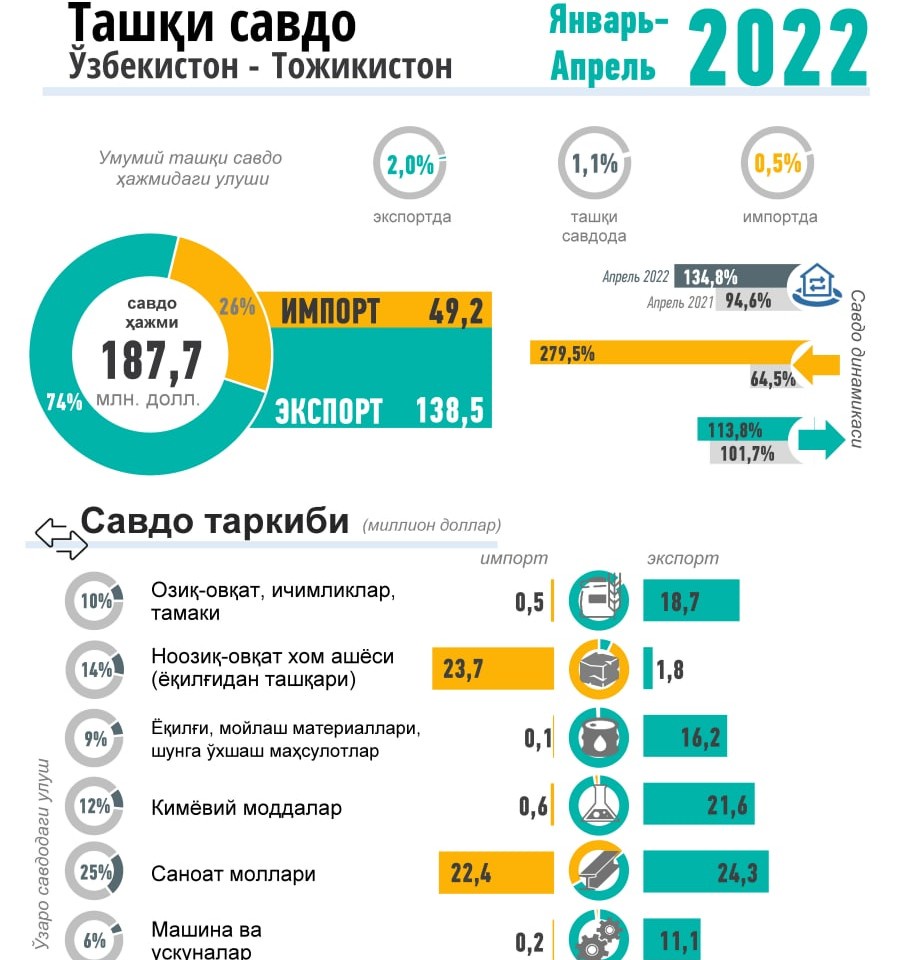 2022 йилнинг январь-апрель ойларида Ўзбекистон ва Тожикистон ўртасидаги товар айирбошлаш ҳажми 187,7 миллион долларни ташкил этди ва 2021 йилнинг шу даврига нисбатан 34,8 фоизга ўсди. Шундан экспорт 138,5 миллион долларни (ўсиш 13,8 фоиз), импорт 49,2 миллион долларни (ўсиш 2,8 баробар) ташкил этди.