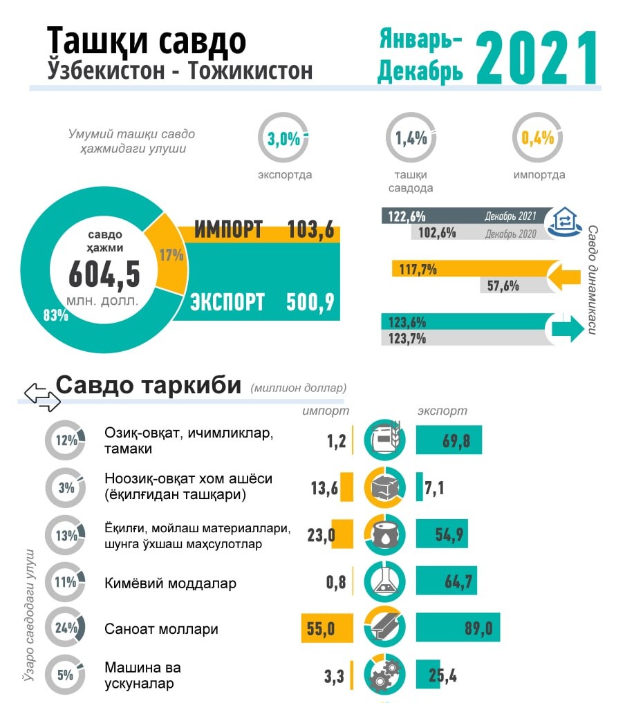 2021 йилда Ўзбекистон ва Тожикистон ўртасидаги ўзаро товар айирбошлаш ҳажми 604,5 миллион долларни ташкил этди, бу ўтган йилга нисбатан 111,4 миллион долларга кўпдир.
