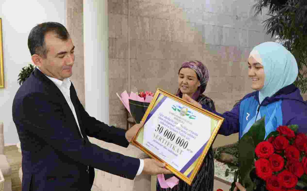 Шунингдек, юртимиз байроғини кўкларга кўтарган спортчи ва унинг мураббийи вилоят раҳбари томонидан мос равишда 30 млн ҳамда 10 млн. сўмлик пул маблағи сертификатлари билан тақдирланди.