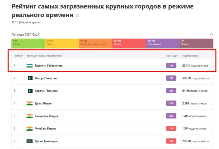 iQAir порталига кўра, Тошкент ҳавосида майда ПМ2,5 дисперс зарраларининг концентрацияси 77,8 мкг/м3 ни ташкил этмоқда.