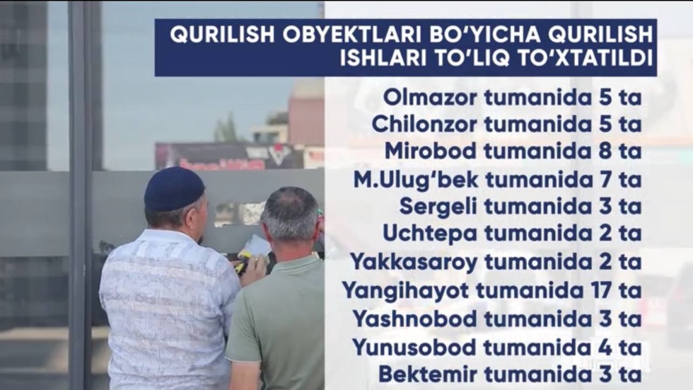 Тошкент шаҳар ҳокимлиги ваколатли ташкилотлар билан ҳамкорликда мазкур масалада қатъий позицияни эгаллаб, қонунбузарлик ҳолатларига нисбатан чоралар кўрмоқда. Шаҳарнинг бир қатор туманларида тўлиқ ҳужжатларга эга бўлмаган 59 та объектда қурилиш ишлари тўхтатилди. Ушбу объектлар электр тармоғидан узилган. Қурилиш майдонларида назорат ва мониторинг ишлари давом эттирилмоқда. Аниқланган ҳар бир қонунбузарлик ҳолати юзасидан белгиланган тартибда ҳуқуқий чоралар кўрилмоқда.