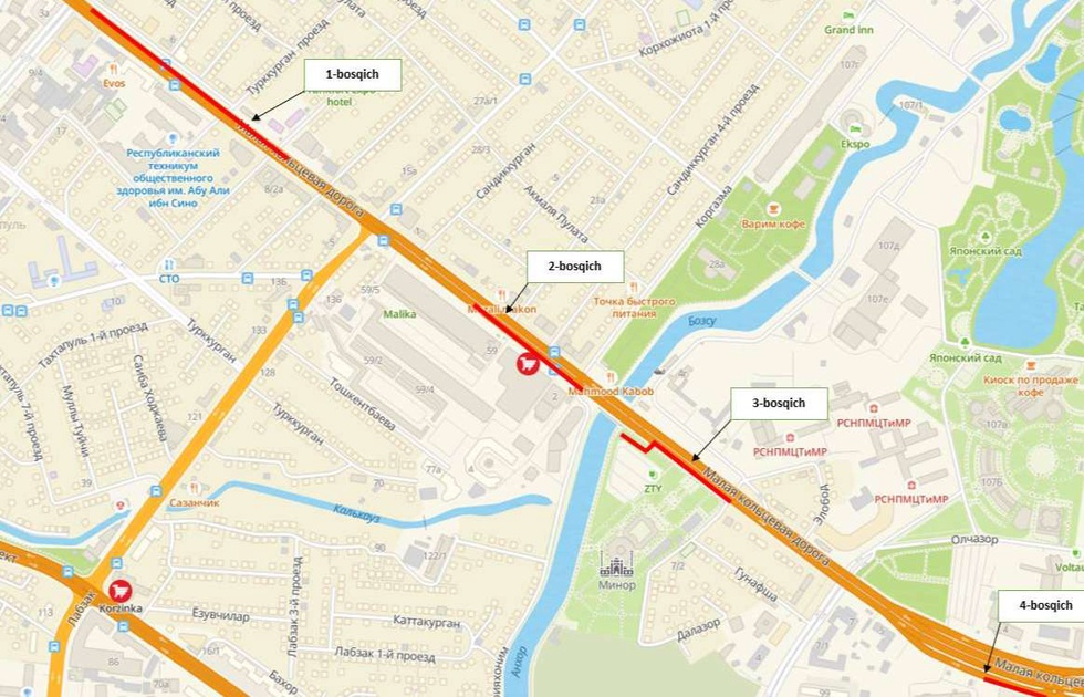 Шу муносабат билан, биринчи босқичида, КҲАЙнинг Туркқўрғон кўчаси билан кесишмасидан Адҳам Раҳмат кўчасигача бўлган ҳаракат йўналишининг бир томони 2024 йил 19 апрелдан бошлаб 7 кун муддатга ёпилади.