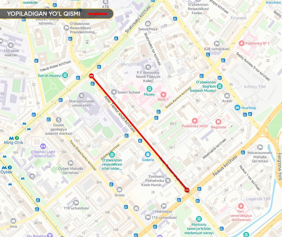 Шу муносабат билан 15 майдан то қурилиш ишлари якунлангунига қадар Амир Темур шоҳ кўчасининг Нукус кўчаси билан кесишмасидан Амир Темур кўчаси бўйлаб Шаҳрисабз кўчаси кесишмасигача бўлган оралиқда йўлнинг бир тасмаси вақтинча ёпилади.