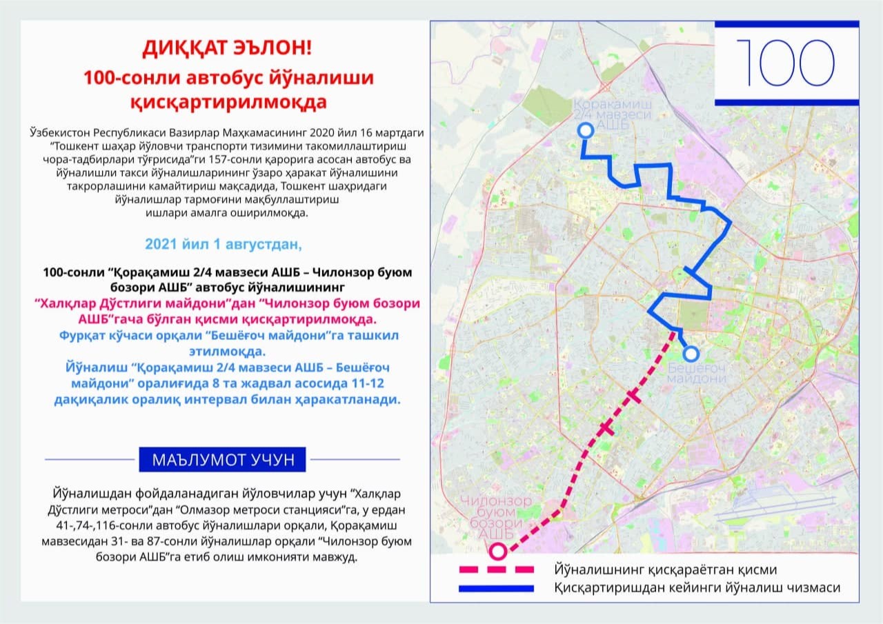 - 50, 86, 100, 124, 41-сонли автобус йўналишлари ҳаракати қисқартирилади.
