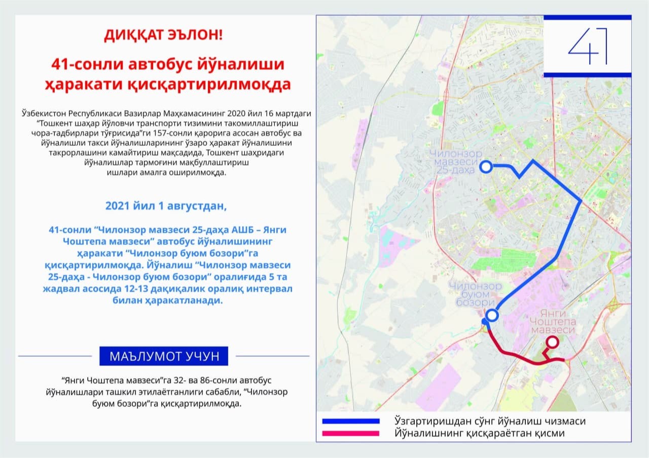 41-сонли “Чилонзор 25-даҳаси — Янги Чоштепа мавзеси” автобус йўналишининг “Янги Чоштепа” мавзесидан “Чилонзор буюм бозори”гача бўлган оралиқдаги ҳаракати қисқартирилади. Эндиликда, 41-сонли йўналиш “Чилонзор 25-даҳаси — Чилонзор буюм бозори” оралиғида 5 та жадвал асосида ҳаракатланади. Маълумот учун, “Янги Чоштепа” мавзеси аҳолиси учун йўловчи транспорти хизматларидан фойдаланишдаги узилишларни олдини олиш мақсадида 1 август кунидан ушбу мавзега 32 ва 86-сонли автобус йўналишлари ҳаракати йўлга қўйилади.