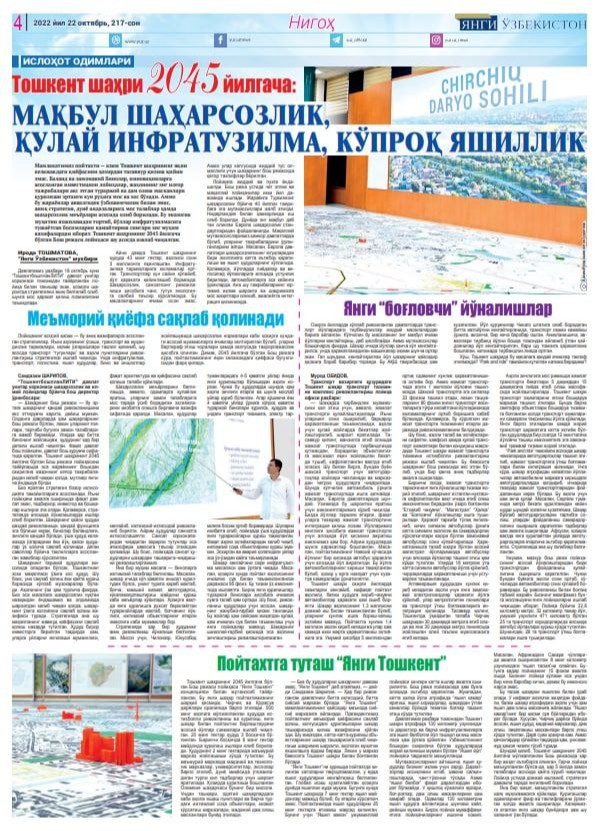 “Янги Ўзбекистон” газетасининг 22.10.22 йил, 217-сонида “Тошкент шаҳри 2045 йилгача: мақбул шаҳарсозлик, қулай инфратузилма, кўпроқ яшиллик” сарлавҳали мақола эълон қилинди. Унда янги лойиҳада нималар акс этгани, Тошкент шаҳрида яқин йилларда нималар ўзгариши борасида мутахассислар маълумотлари билан танишишингиз мумкин.