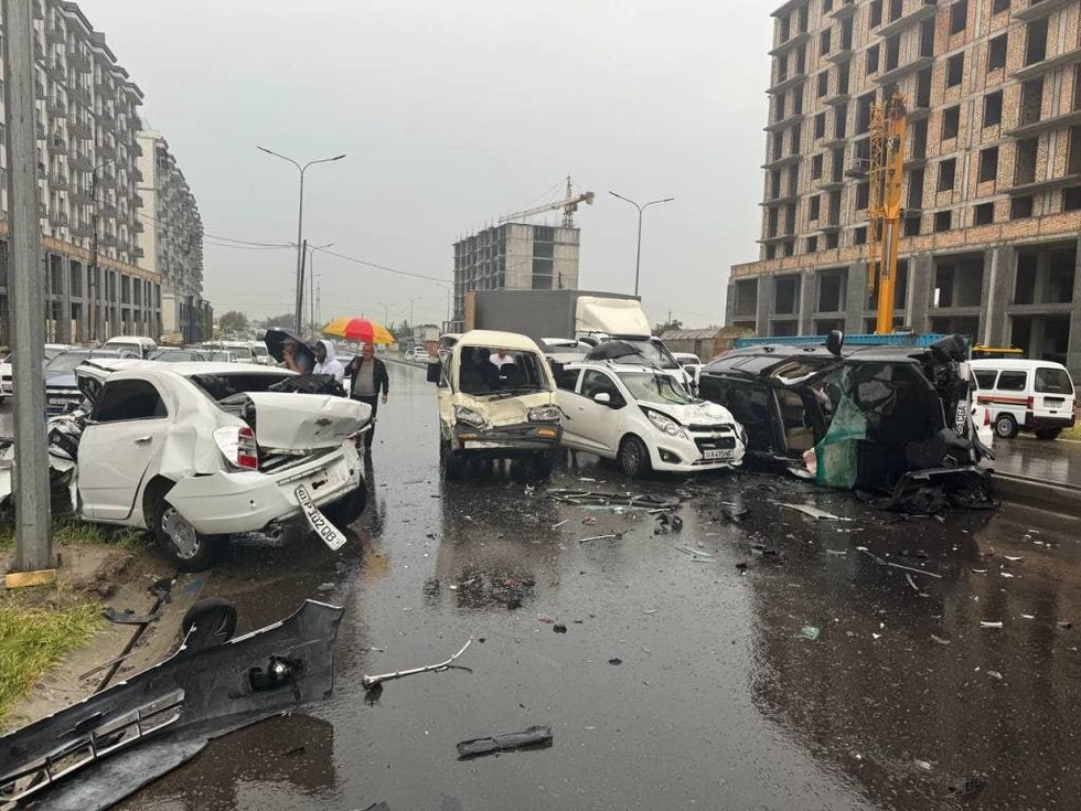 У ўз йўналишидан қарама-қарши йўлга чиққан вақтида рўпарасидан келаётган “Cobalt”, “Damas” ва “Spark” русумли транспорт воситалари билан қаттиқ тўқнашув содир этган.