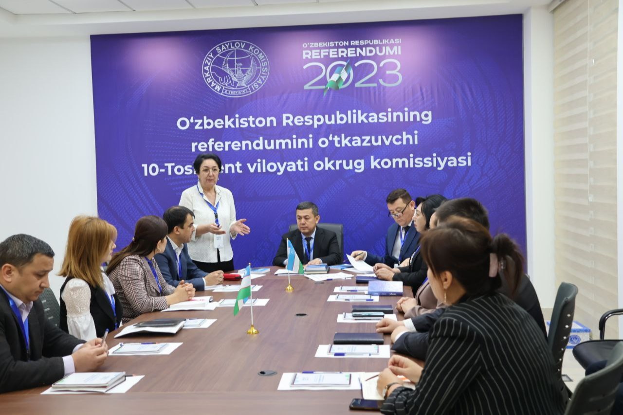 Дастлаб округ комиссияси раиси Улуғбек Тўхтаев комиссия аъзоларига гувоҳномаларни топширди. Кун тартибидаги ташкилий масалалар кўриб чиқилди. Комиссия аъзоларига фаолиятини самарали ташкил этиш ва референдум бўйича аҳоли билимларини янада ошириш борасида сўз юритилди.