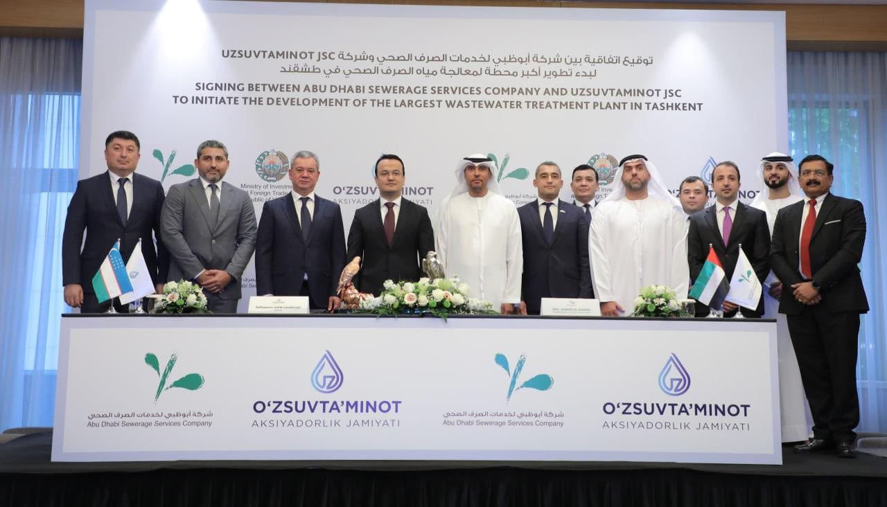 Пойтахтимиздаги “Hyatt Regency” меҳмонхонасида “Ўзсувтаъминот” AЖ ва Бирлашган Aраб Aмирликларининг “Abu Dhabi Sewerage Services” (ADSSC) компанияси ўртасида ўзаро ҳамкорлик тўғрисида меморандумни имзолаш маросими бўлиб ўтди.