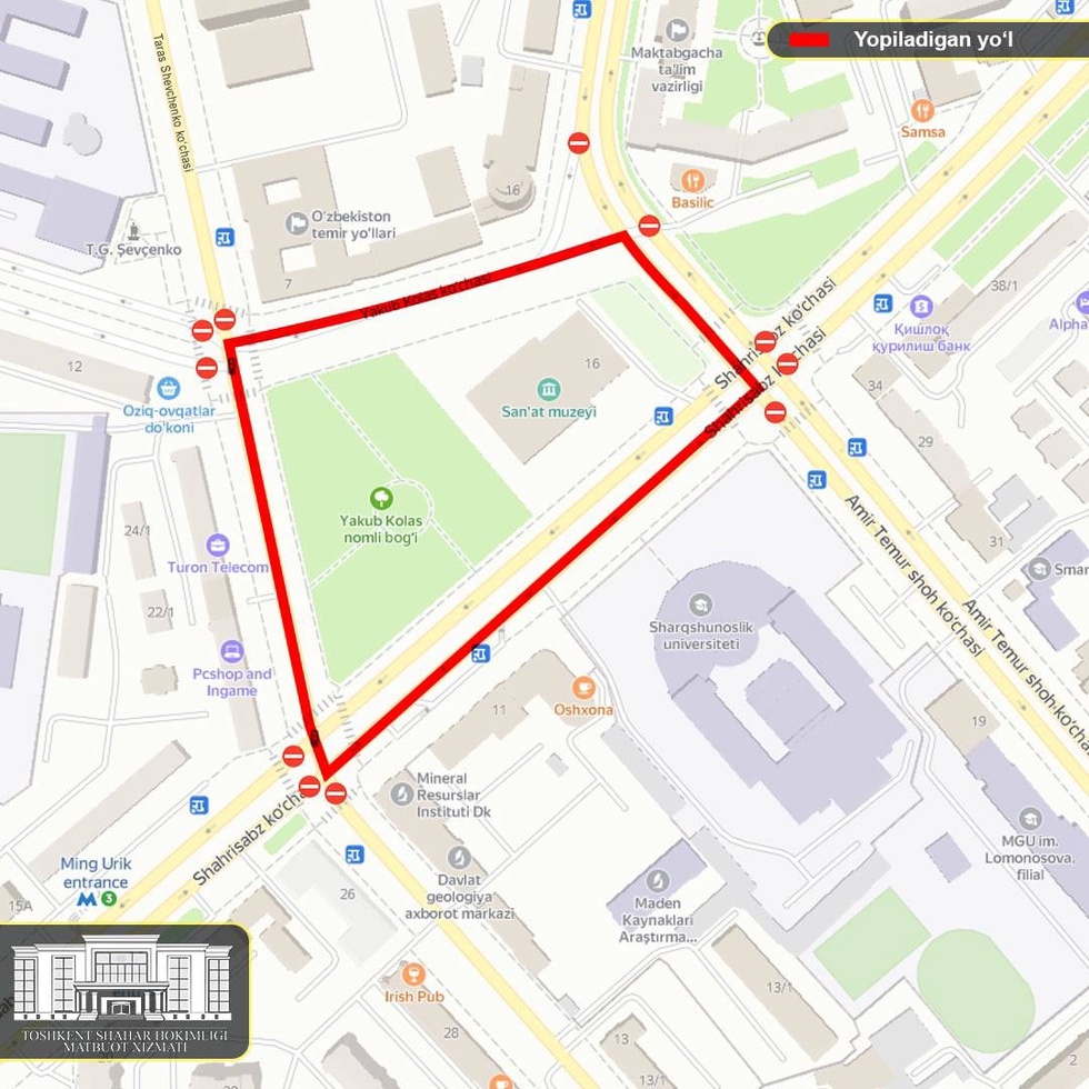 • Тарас Шевченко кўчаси - Якуб Колас кўчаси кесишмасидан Шаҳрисабз кўчаси кесишмасигача;