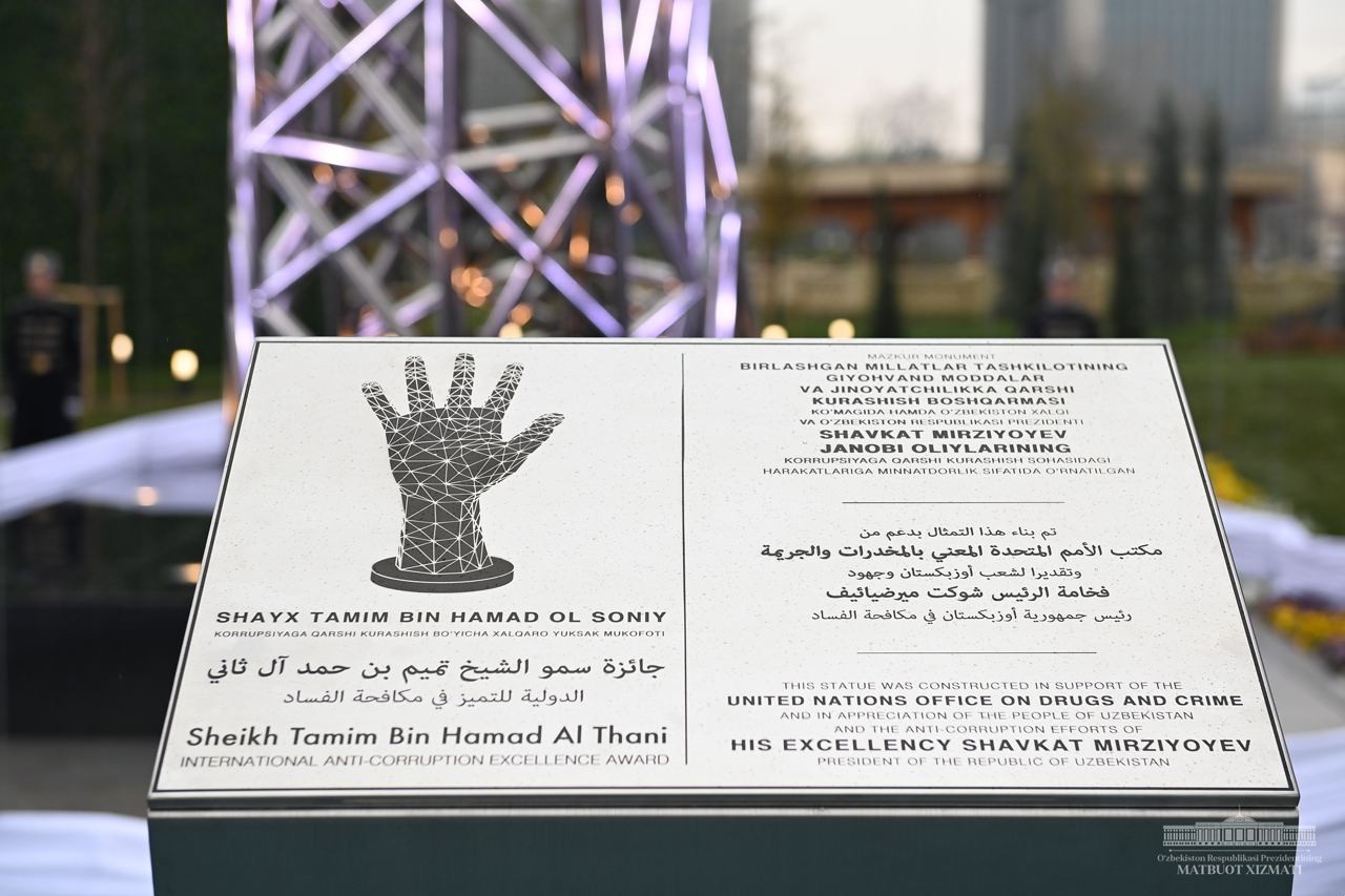 Кафти очиқ қўл кўринишида металлдан ишланган ушбу ўн икки метрлик композиция ҳалоллик, пок амал ва ниятларни, коррупцияга нисбатан мутлақ тоқатсизликни, дунёнинг барча мамлакатларини унга қарши курашишда бирлашишга чақириқни англатади.