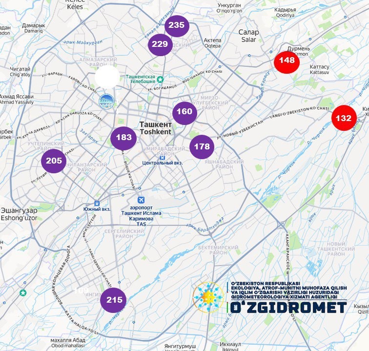 - PM2,5 — 187,2 мкг/м³. Бу рўхсат этилган меъёр (60 мкг/м³)дан 3,1 баробар юқори.